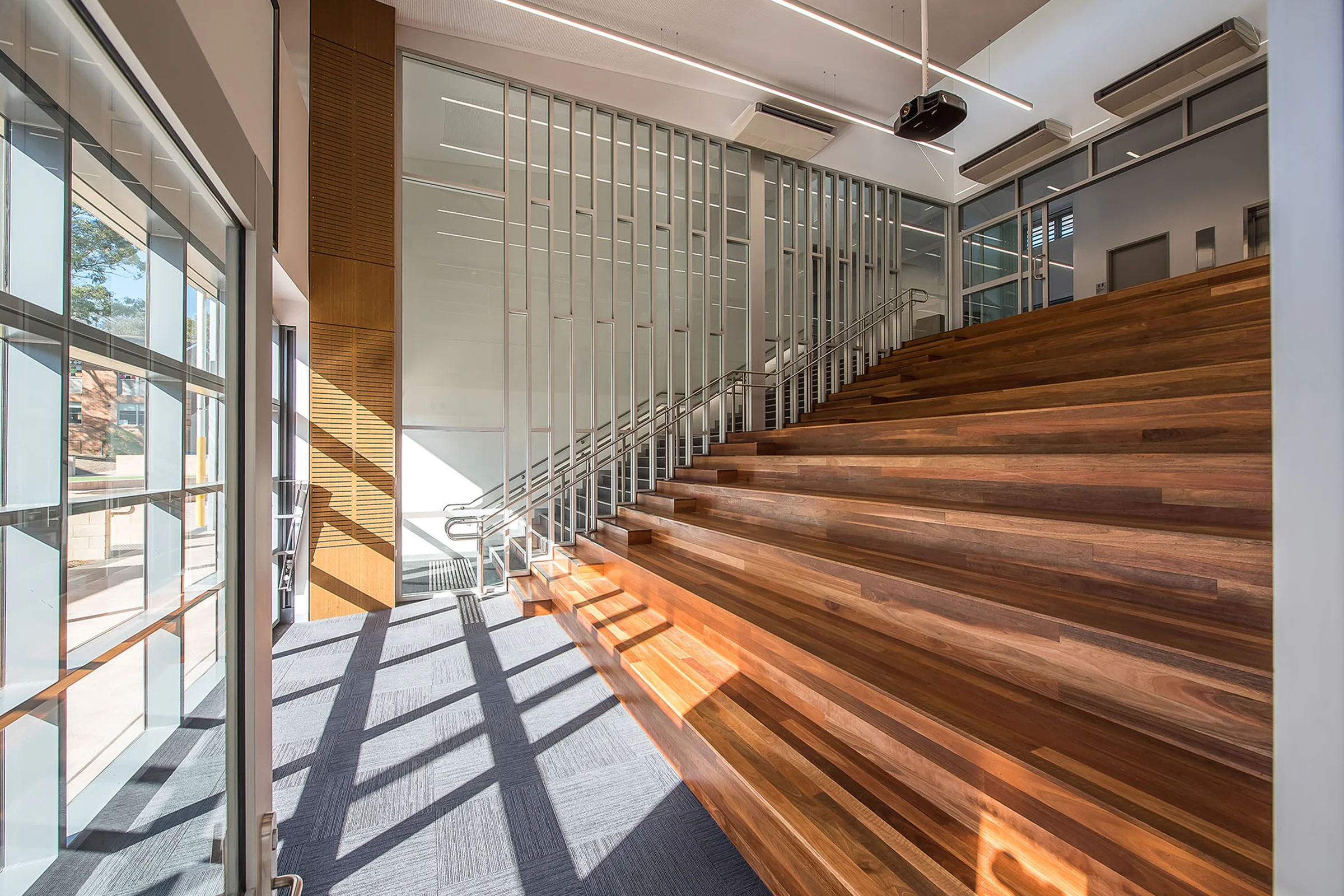 The new building contains 12 home bases with separate practical activities and presentation spaces, a new library and tiered seating space, and an undercroft area containing the canteen and service/ storage rooms.