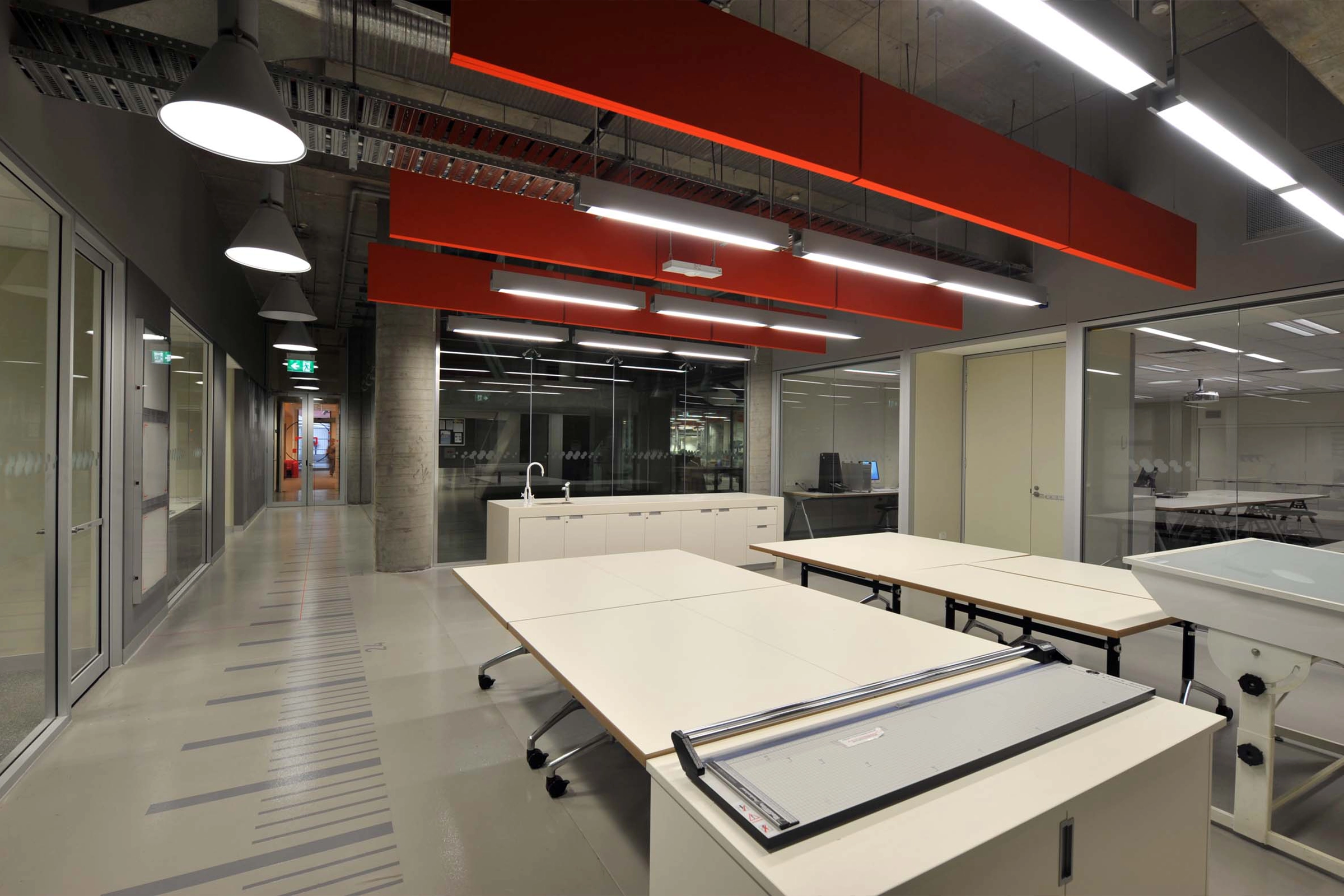 A series of specialised suites within Building 06 provided the faculty of Design, Architecture and Building (DAB) with a variety of innovative learning environments that recognised changing pedagogies in tertiary education. They facilitated partnerships and ‘cross pollination’ of ideas with industry by providing specialised, professional working environments such as: